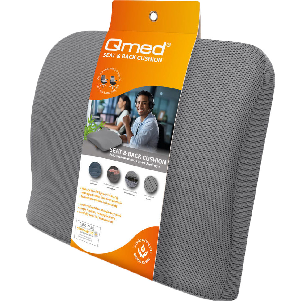 During sedentary work, the muscles need to keep the trunk, neck and back of the neck in a fixed position, which can reduce blood flow and cause constant tension in the lower back, thigh and buttock muscles. The QMED Bamboo&Gel Seat and Back Cushion provides excellent comfort, supporting correct posture during long periods of sitting. The ergonomic and contoured design of the cushion allows it to be used in two planes. The flexible cooling gel layer, activated by body pressure, cools the skin pleasantly, increasing the comfort of long sessions. It is made of bamboo charcoal powder, which has antibacterial, moisture- and odour-absorbing properties that can help reduce feelings of stress and fatigue.